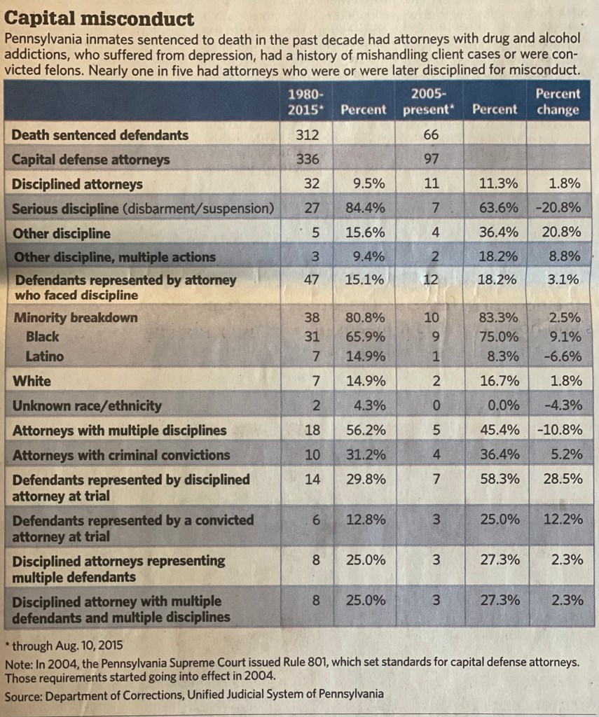 Pennsylvania inmates sentenced to death in the past decade had attorneys with drug and alcohol addictions, who suffered from depression, had a history of mishandling client cases or were convicted felons. Nearly one in five had attorneys that were or were later disciplined for misconduct.