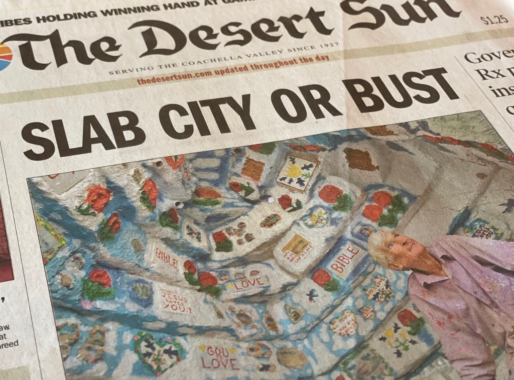 Every couple of years a politician gets an itch to clean up the Slabs. Few Slabbers believe the county will be successful, if past attempts are any indication. They also feel protected in the shadow of “Salvation Mountain,” which draws untold curious tourists from across the globe. Shuttering the Slabs also means leveling Leonard’s mountain.